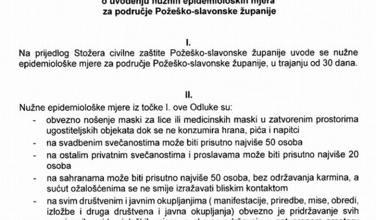 Odluka o uvođenju nužnih epidemioloških mjera za područje Požeško-slavonske županije primjenjuje se od ponedjeljka 7. rujna